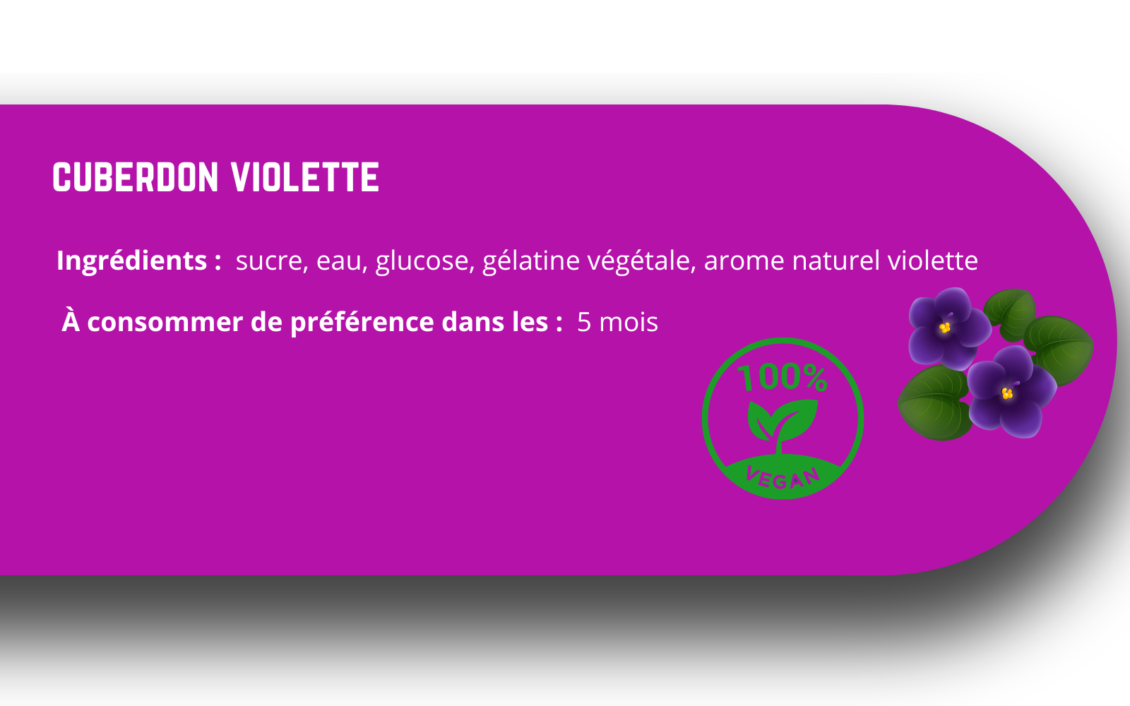 - Symphonie de Saveurs : Chaque cuberdon est une œuvre d'art, fusionnant l'arôme intense de violettes sélectionnées avec amour et l'excellence d'une confiserie franco-belge.