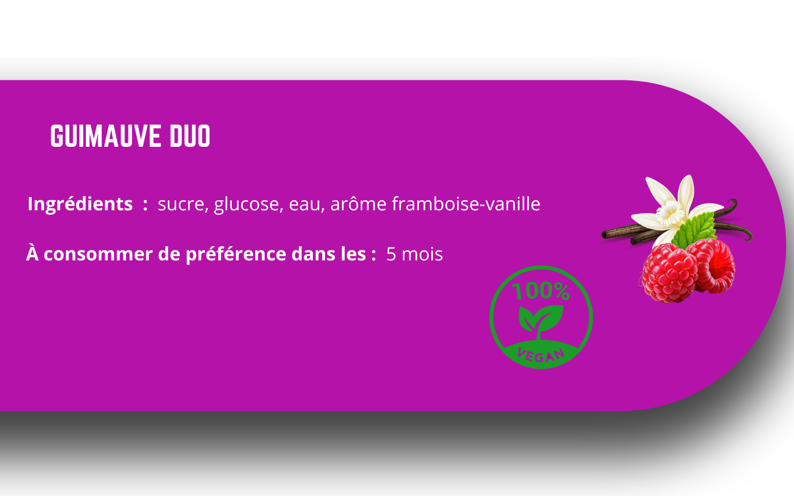 Laissez-vous charmer par l'alliance raffinée de la vanille et de la framboise dans nos guimauves duo. Ces délices moelleux marient deux arômes emblématiques pour une expérience gustative en deux actes : la vanille, douce et enveloppante, suivie de la fraîcheur acidulée de la framboise, une combinaison classique revisitée dans une guimauve artisanale.