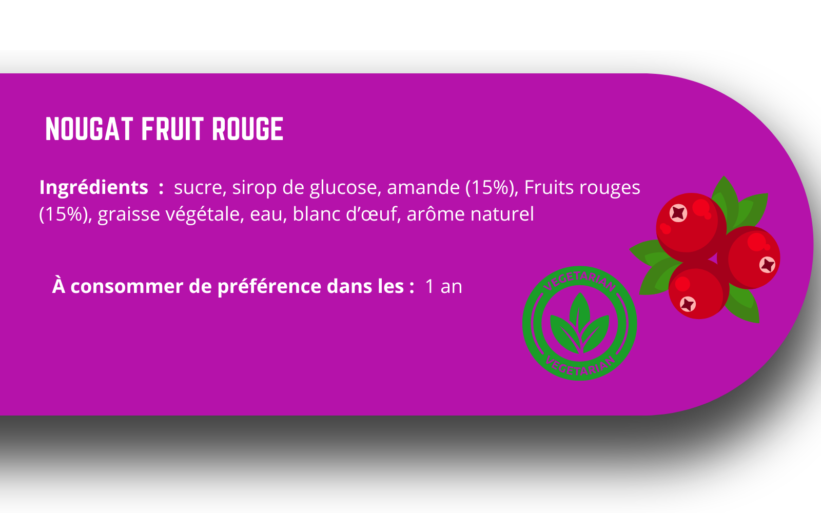 - Texture Contrastée : La douceur fondante du nougat et le croquant des fruits secs s'allient à la fermeté acidulée des cranberries pour une expérience en bouche des plus satisfaisantes.